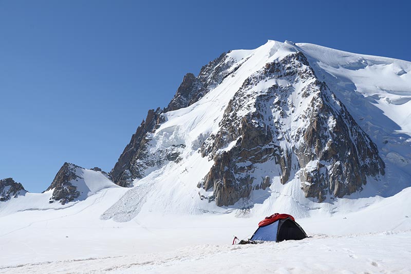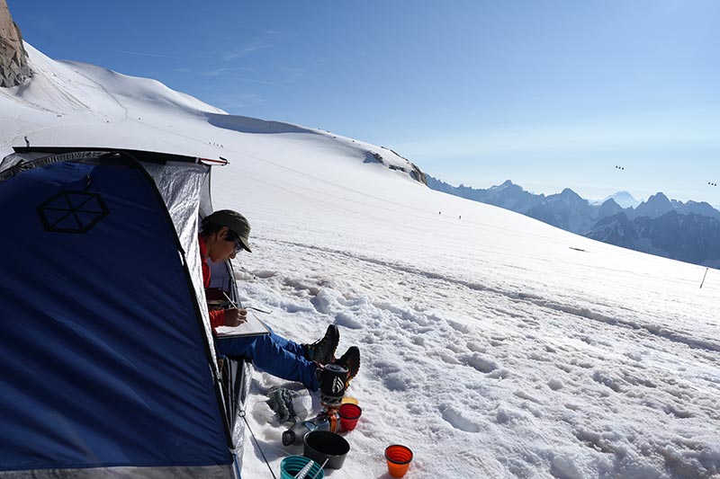 昨年、モンブラン山群へクライミングトリップに出かけた。画材を持っていったのは言うまでもない。氷河上でのキャンプ。2.0の横開きの大きな出入り口のおかげでテントの中にいながら(お尻にマットを敷いたまま、あるいは膝までシュラフに潜ったままで。実はその時体調不良でとても外で描く気力がなかった)、朝な夕なに刻々と色彩を変える山々をスケッチできたのは至高のひと時だった。こんなにも大きく風景が見渡せるテントは他にないだろう。私にとって2.0は快適な住空間であるのはもちろん、大切なアトリエでもある。