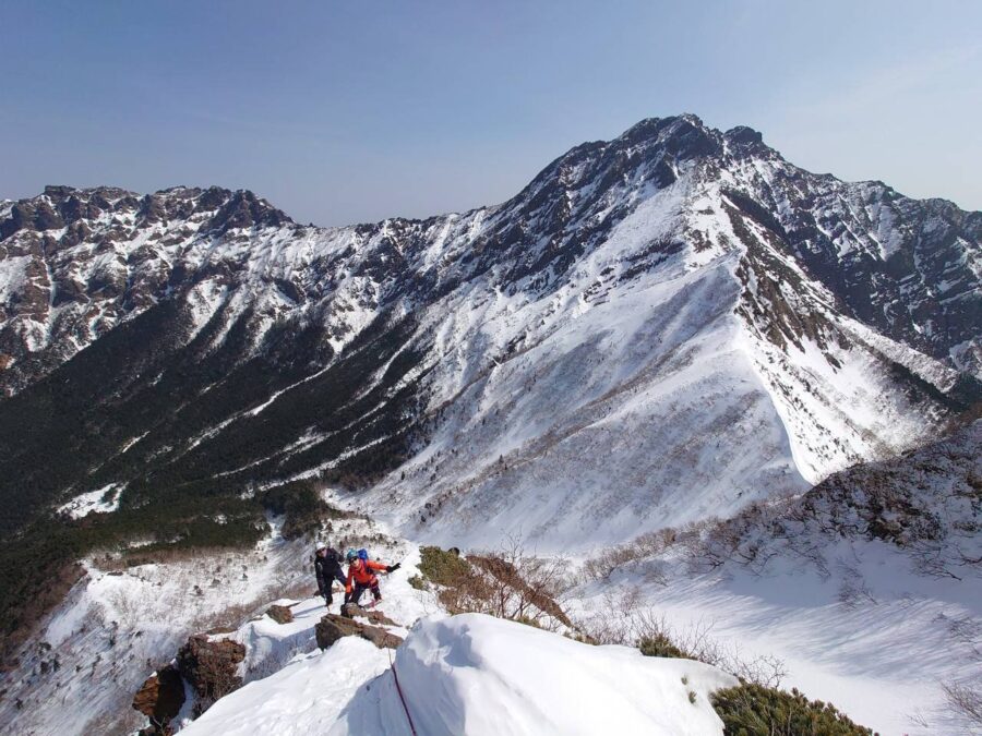 日本でも最も入門的な3000m級の雪山のひとつ、赤岳を登ります。文三郎道から登り、稜線に出ると、素晴らしい眺望。帰りは地蔵尾根を下ります。ピッケルやアイゼンを使って登りますが、難しい部分はしっかりロープを使って確保するので安心してトライすることができます。